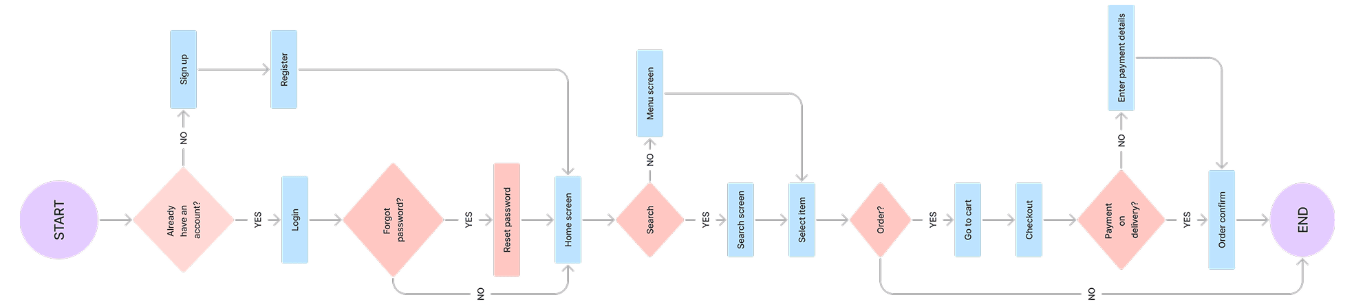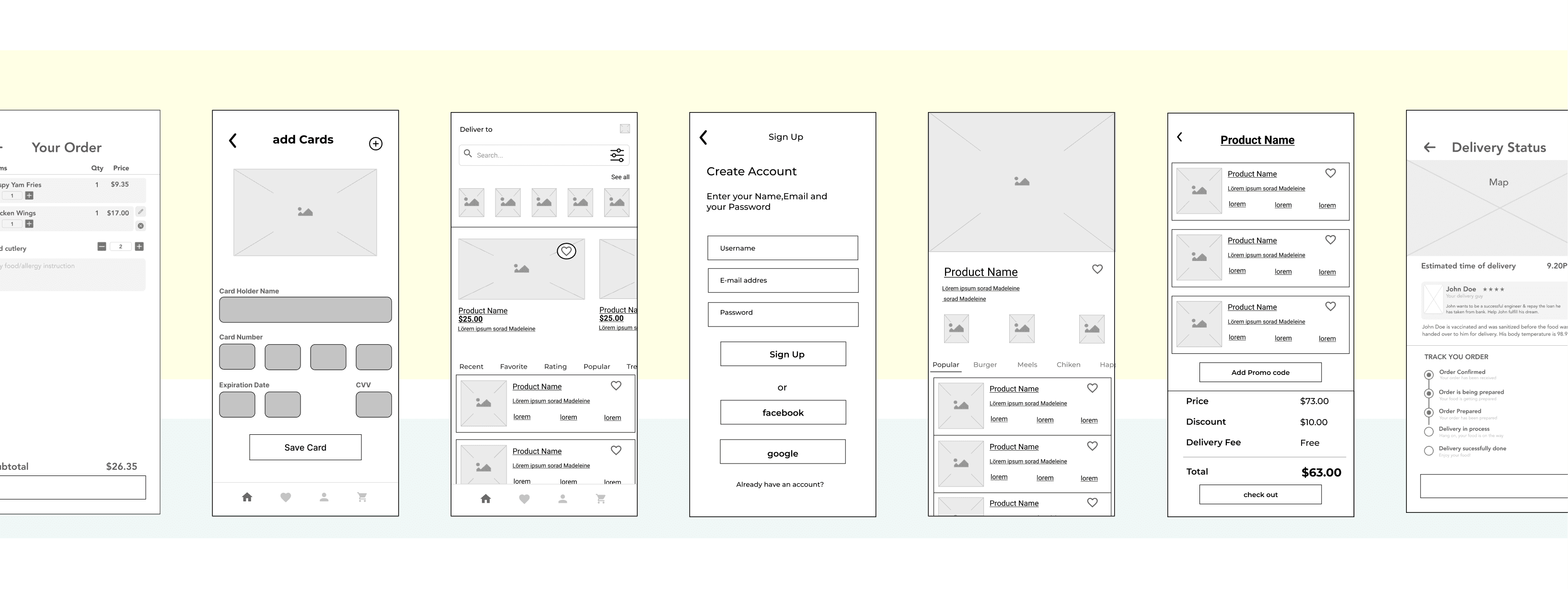 With the flow established, I built low-fidelity wireframes in Figma focusing on layout structure, component hierarchy, and interaction patterns. No colour or imagery was used at this stage — the goal was to stress-test usability purely through layout. I ran three rounds of informal feedback sessions during this phase, resulting in significant changes to the home screen hierarchy and the cart/checkout flow.