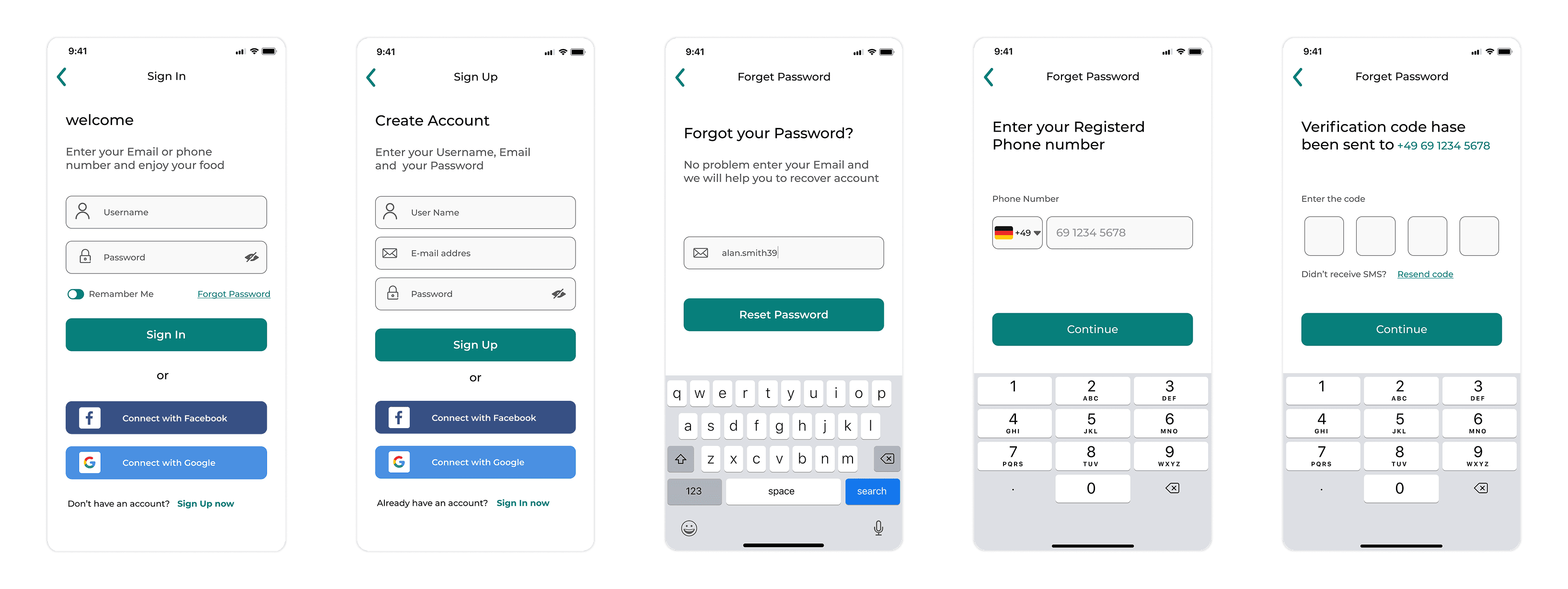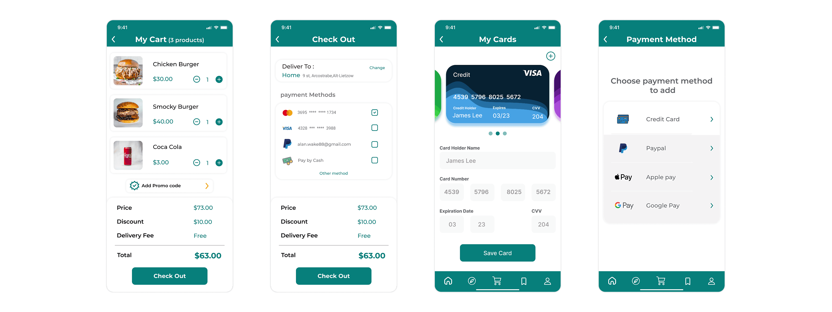 The final design phase produced a complete set of high-fidelity screens across six functional areas: Welcome & Main Page, Registration, Restaurant Page, Payment & Card, Delivery Tracking, and supplementary pages (profile, orders, saved, settings). An interactive prototype was built in Figma and used for final usability validation.