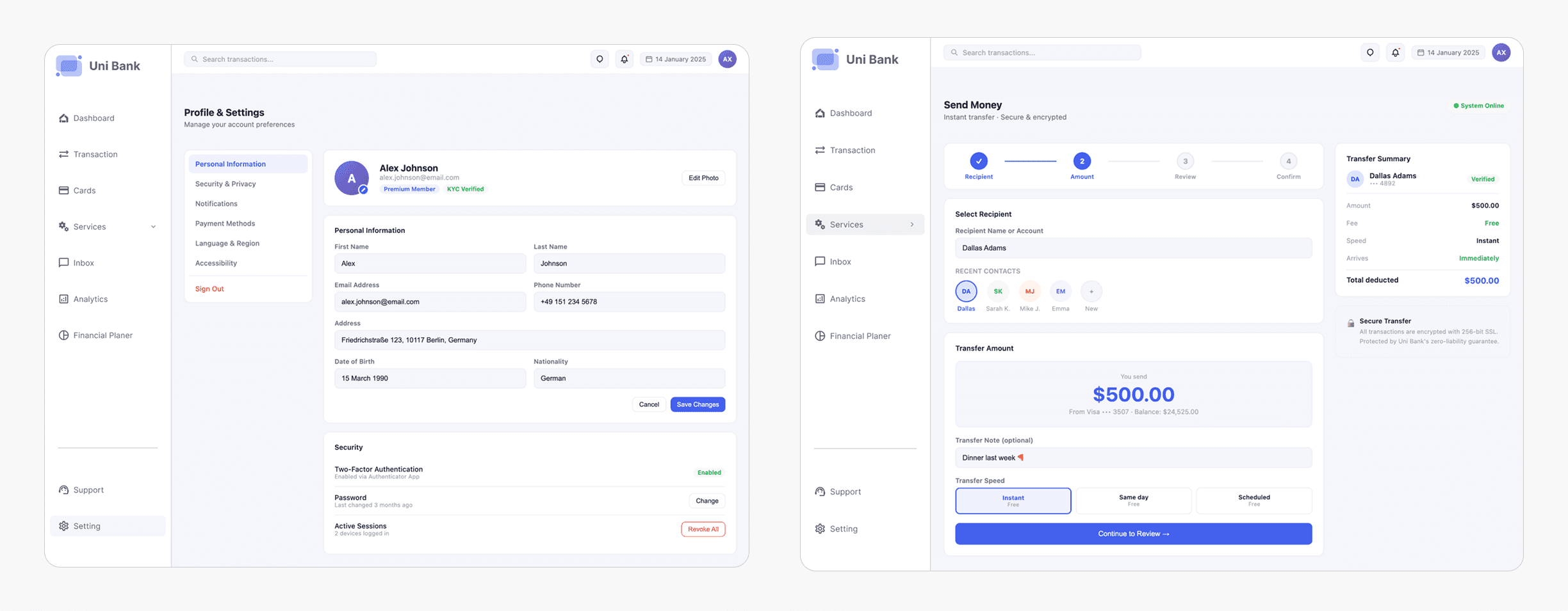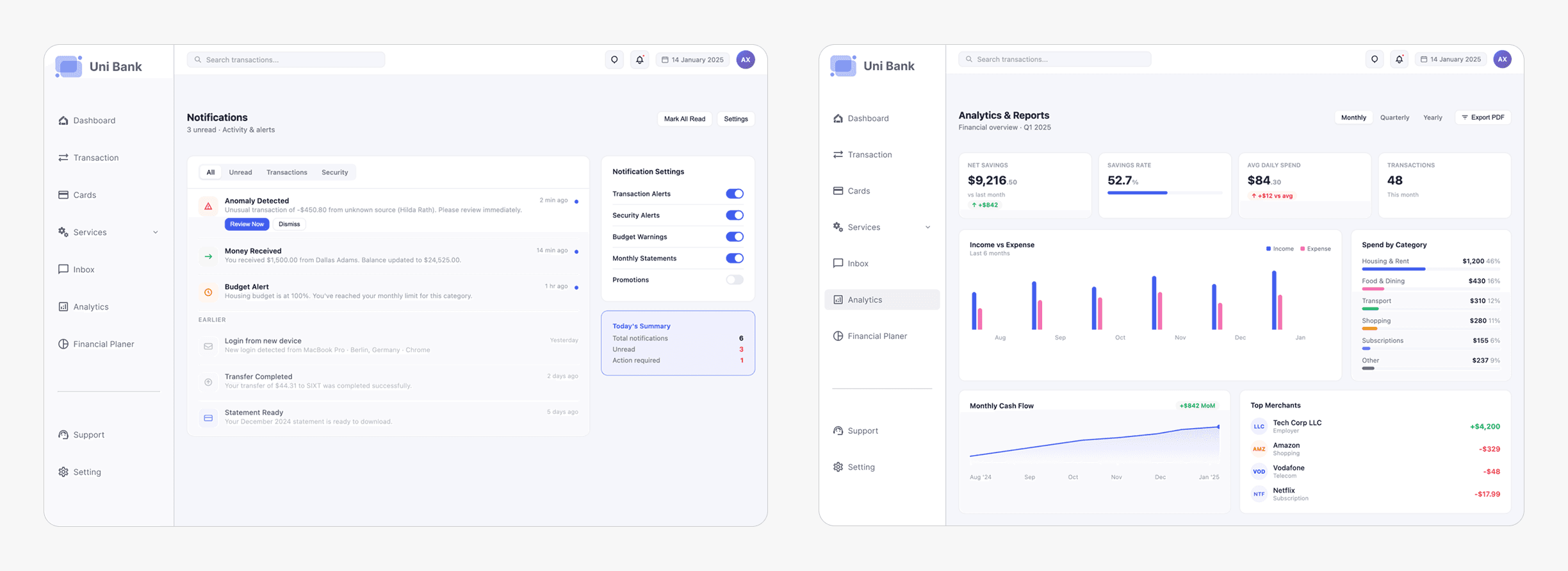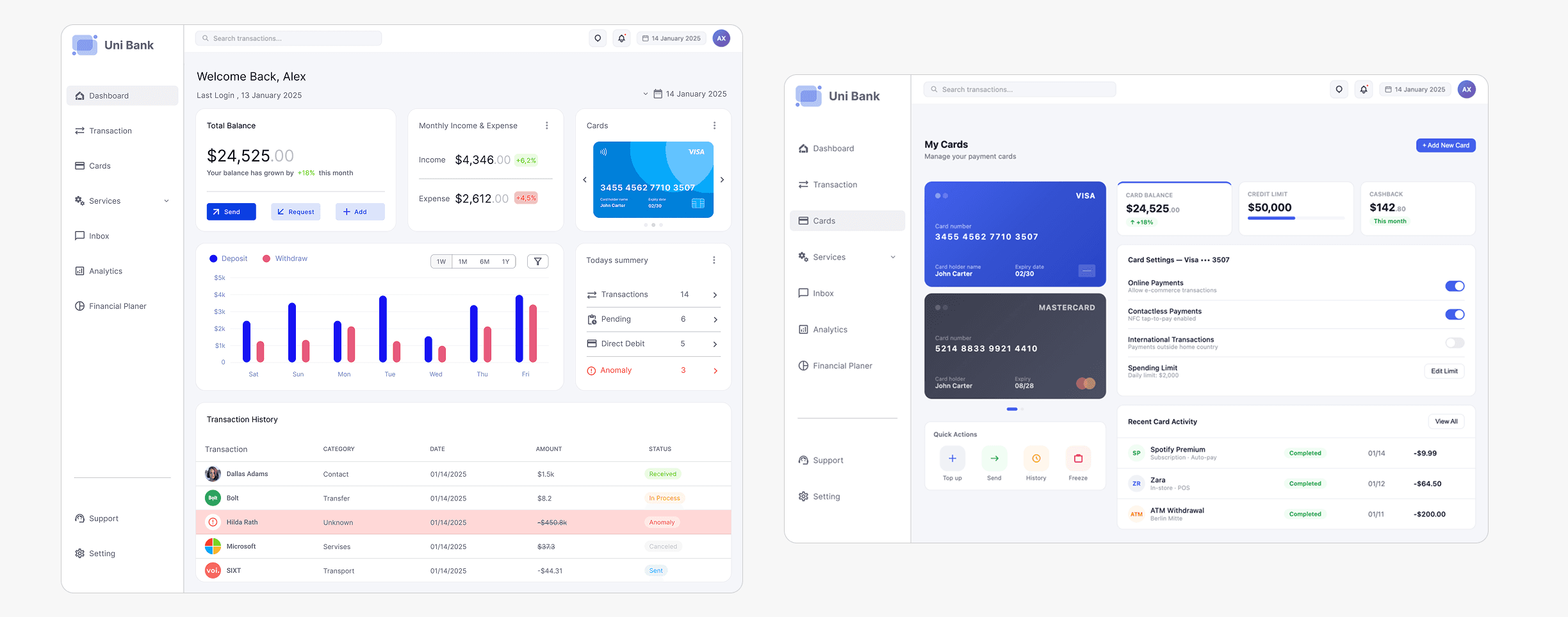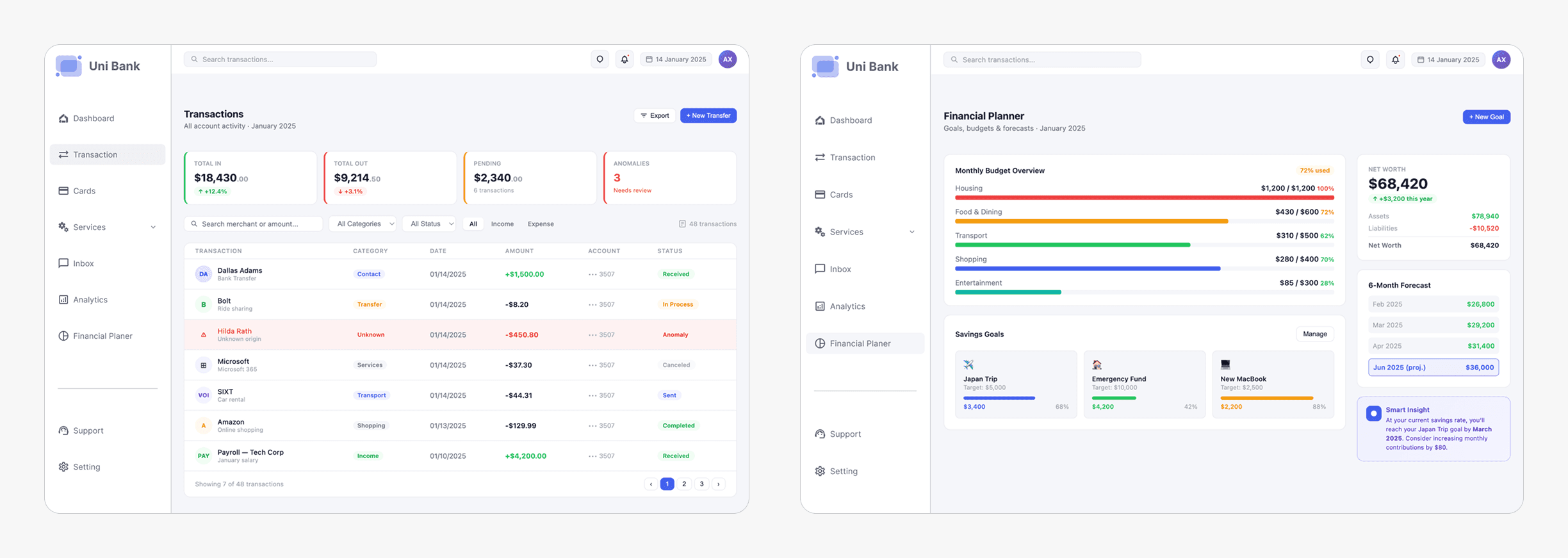 UniBank is a web-based personal finance dashboard used by individuals who want a clearer picture of their financial life. It consolidates balance tracking, transaction history, card management, spending analytics, payment flows, and budget planning into one interface, replacing the tab-switching, app-juggling, and mental arithmetic that most people currently call "managing their finances."