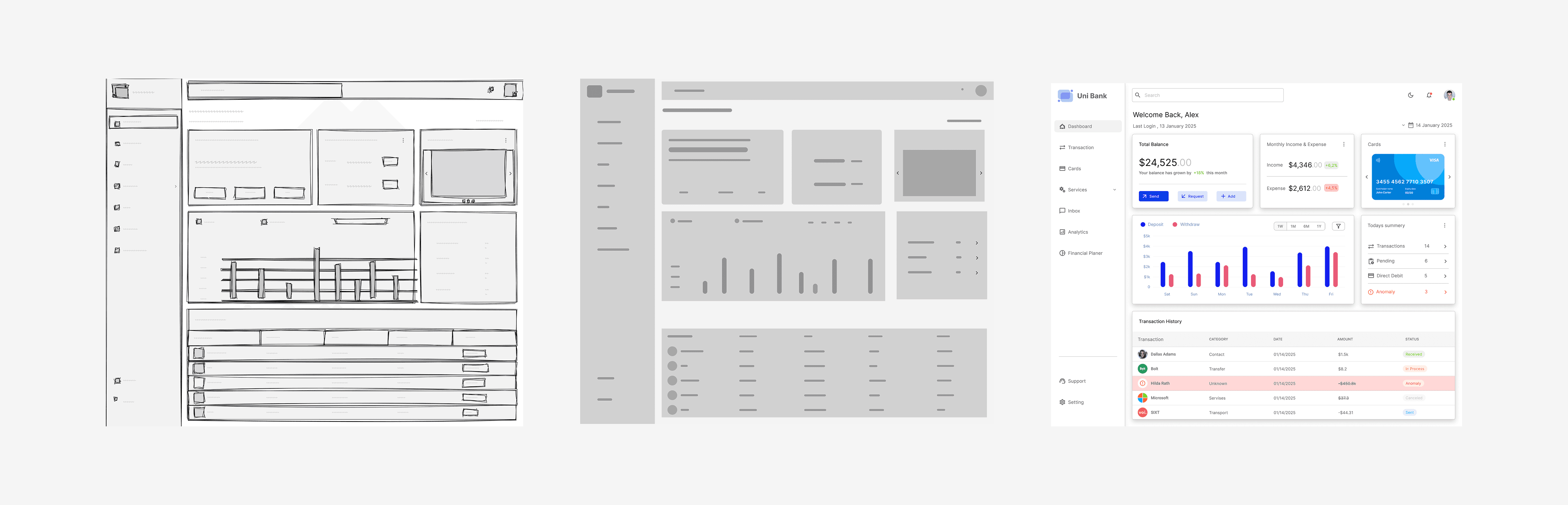 I wireframed in monochrome for two full weeks before applying any color. This forced clear thinking about what was primary (balance, anomalies, recent transactions), secondary (category breakdowns, card status), and tertiary (historical analytics, account settings). Color was applied only after the spatial hierarchy was already working on its own.