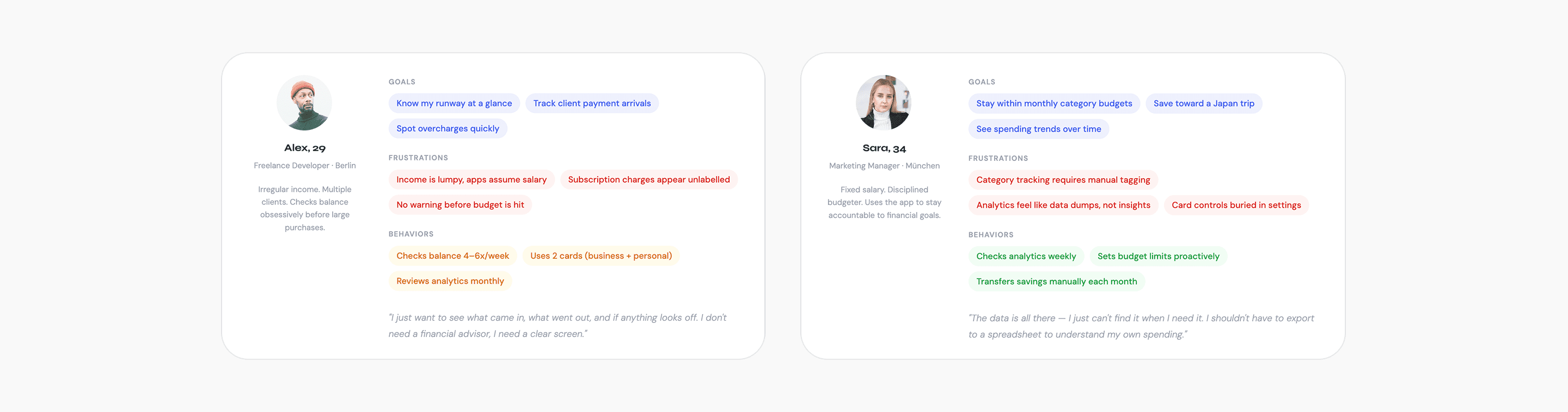 Insight 3: Users treat their banking app like a weather app. quick glance, actionable insight, done. Most sessions are under 90 seconds. The design must optimize for that reality, not for long-form exploration.