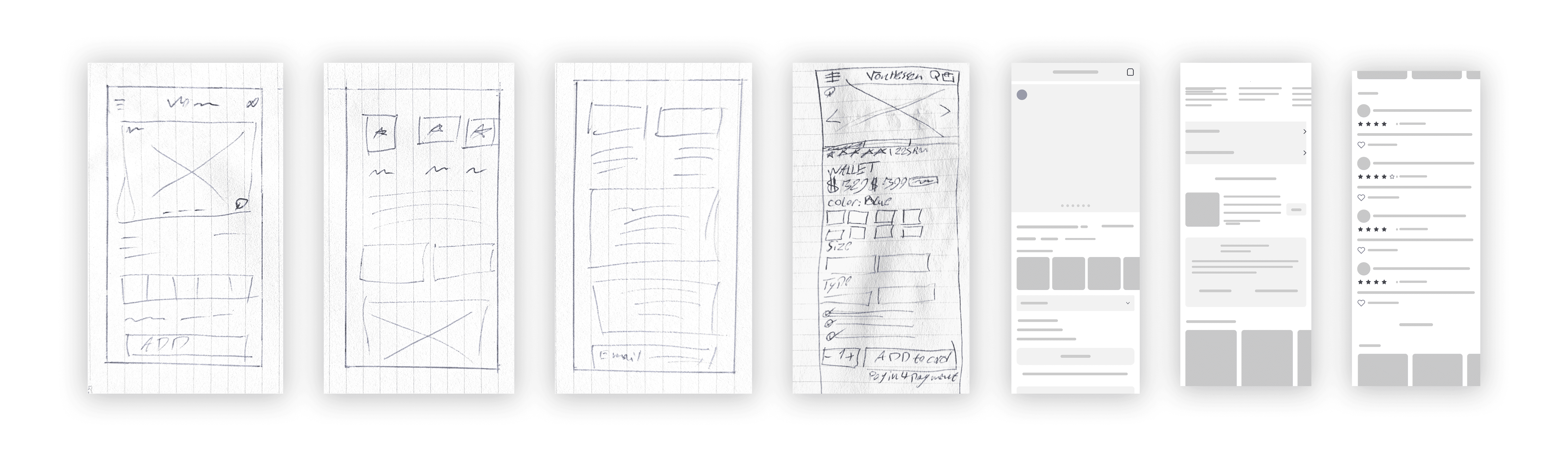 I started with paper sketches, exploring around eight to ten rough layout variations. The questions I was working through: how much space should the gallery take? Where do the trust signals sit relative to the CTA? How does the product information get organized so it's fast to scan?